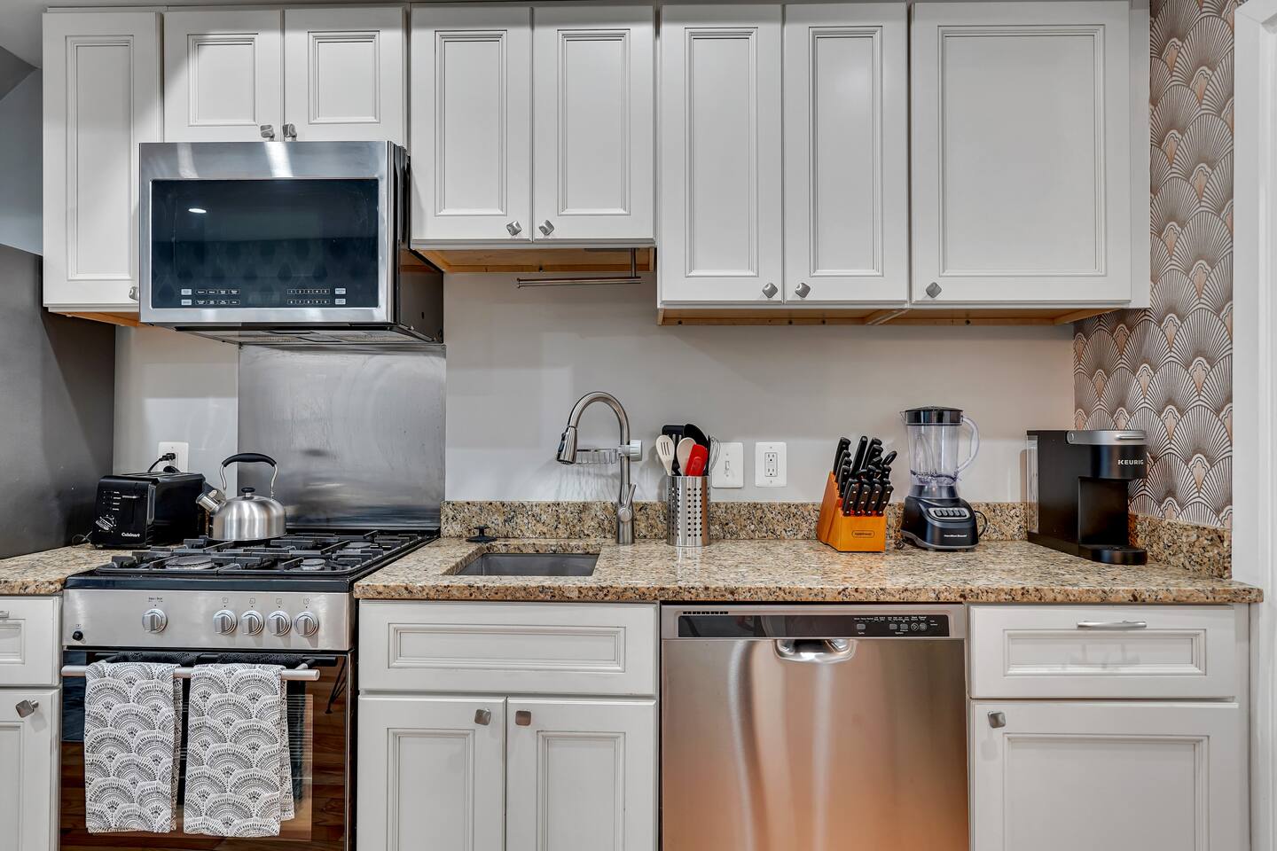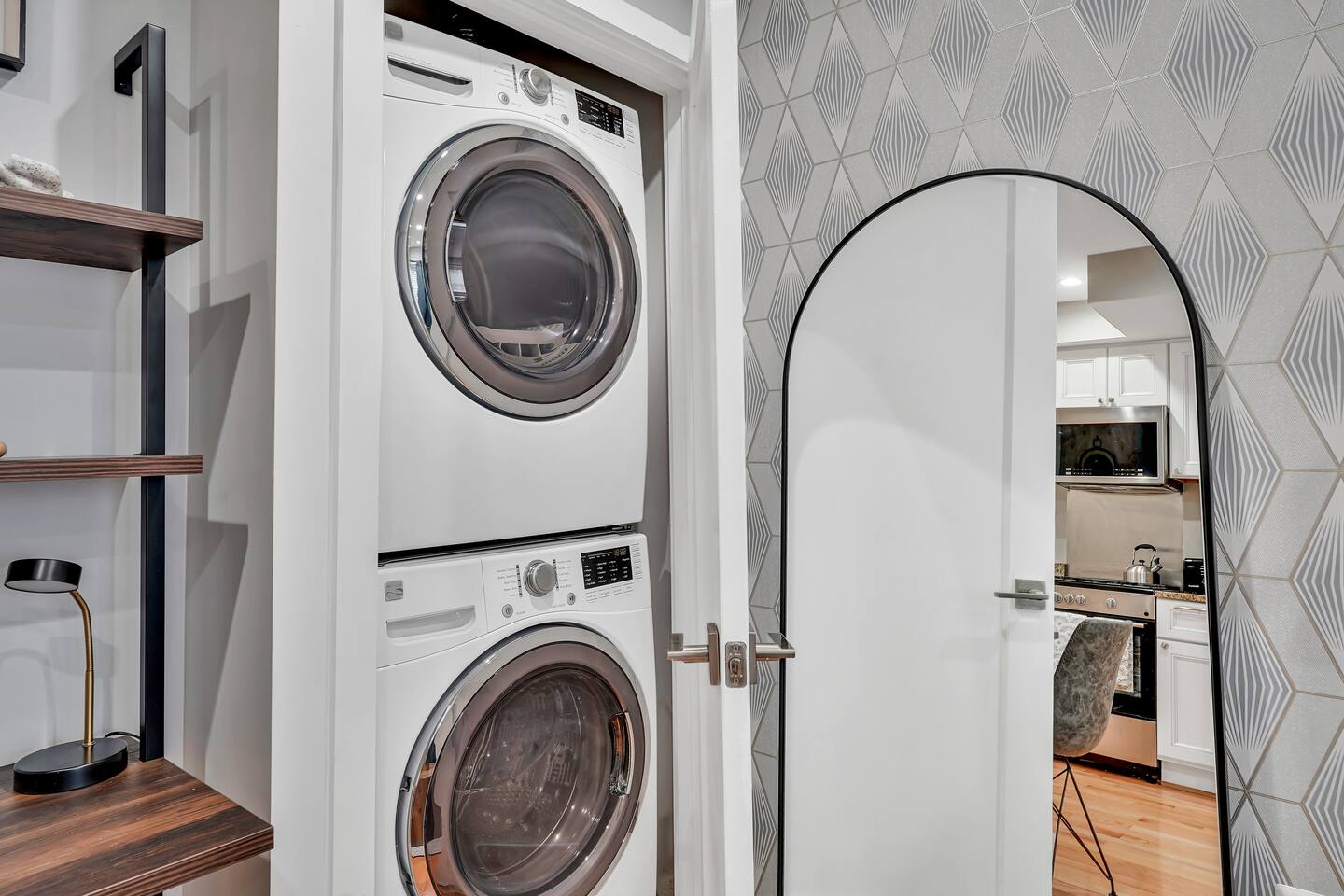 1-bedroom, 1-bath condo located on the first floor of a two-story building Fully stocked kitchen with coffee maker, microwave, stove/oven, refrigerator, and essential appliances Free high-speed Wi-Fi Smart TV with premium streaming channels Comfortable queen-size bed with quality linens Closet space for your belongings Full-size washer and dryer available for guest use Central air conditioning and heating — adjustable to your desired temperature Fresh toiletries provided for your stay